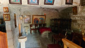 Di fronte all’iconostasi si trovano i due ingressi alla cripta con il suo pozzo profondo 32 metri, dal quale, con un certo sforzo, è possibile ancora oggi attingere acqua fresca.